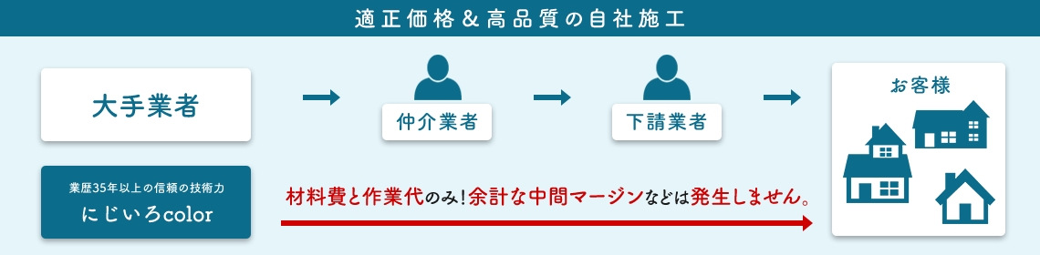 また、コストの面でも間にほかの業者を挟まない分、中間マージンという仲介手数料が不要です。最適な価格で高品質な施工をお届けしております。